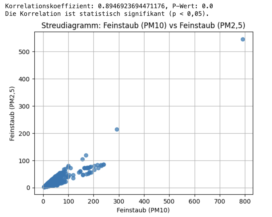 Die Konzentration von Feinstaub (PM10) und die Konzentration von Feinstaub (PM2.5) waren stark positiv korreliert (r = 0,89, p < 0,05). Wenn ein Luftschadstoff hoch war, war auch der andere hoch. Daher stützt das Ergebnis die Hypothese.
