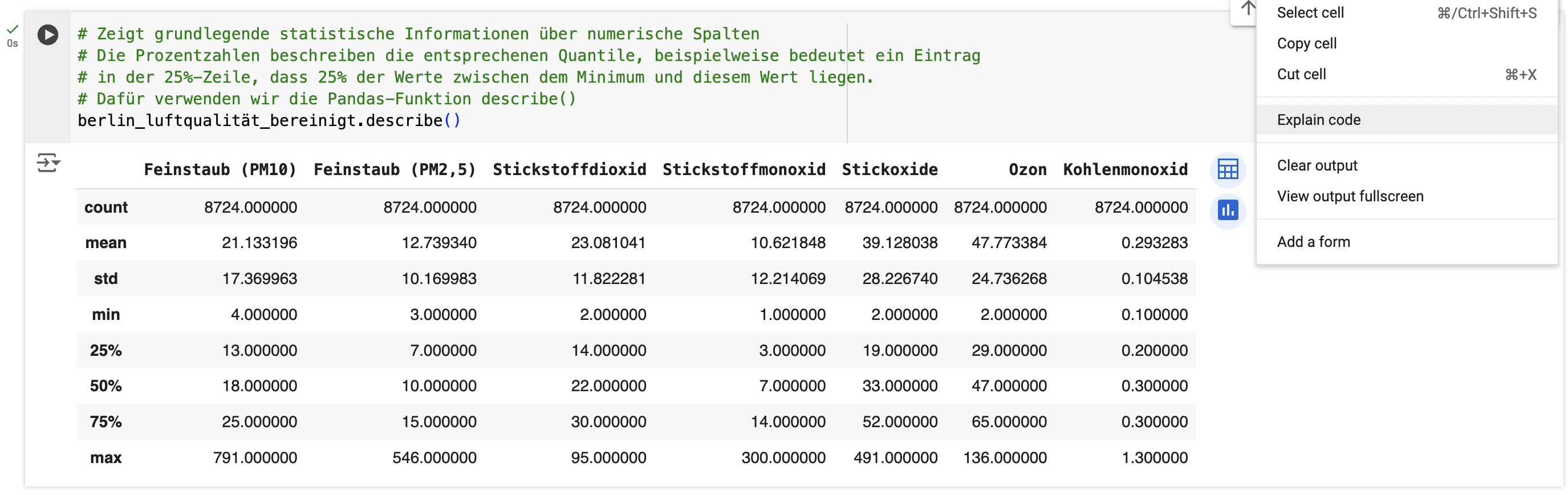 In den Codezellen gibt es die Option „Code erklären“, die Sie verwenden können, falls Sie den Code nicht genau verstehen. Gemini liefert eine Erklärung.