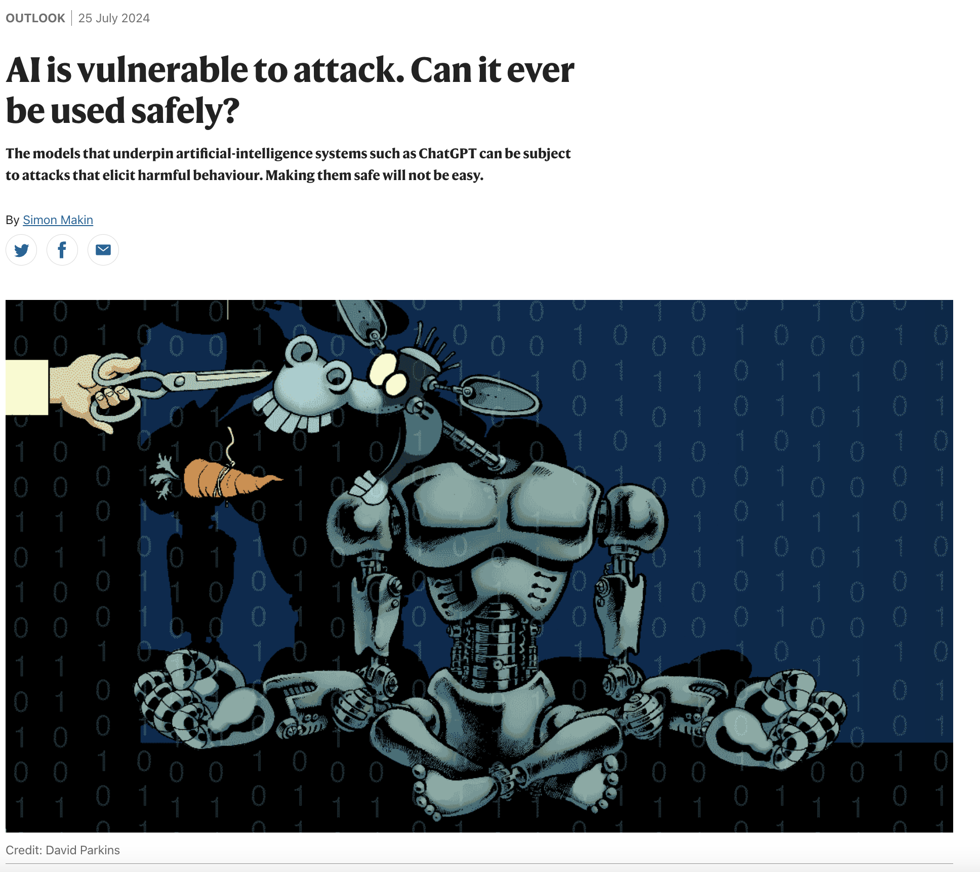 Makin, Simon. “AI Is Vulnerable to Attack. Can It Ever Be Used Safely?” Nature, July 25, 2024. https://doi.org/10.1038/d41586-024-02419-0. |