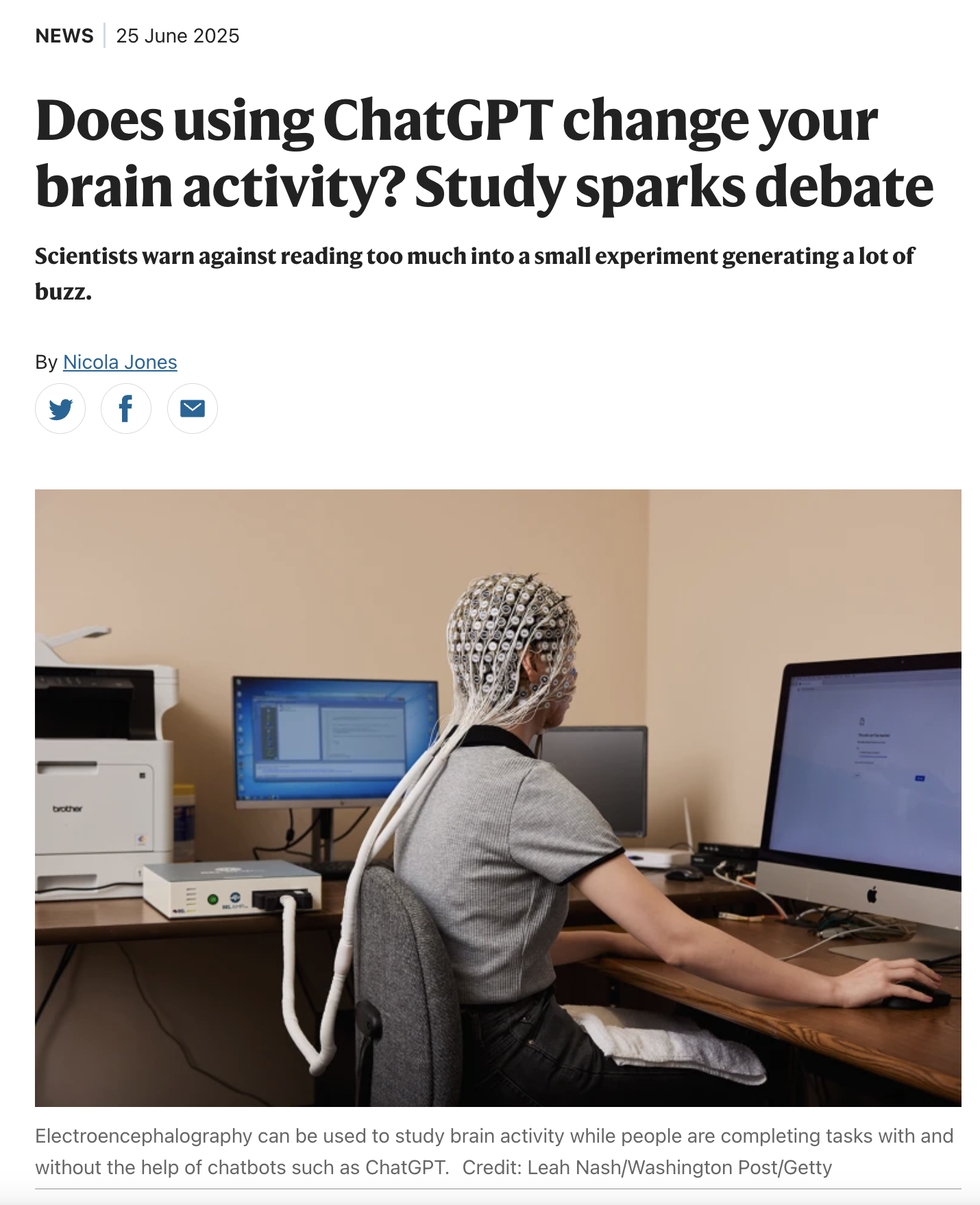 Jones, Nicola. “Does Using ChatGPT Change Your Brain Activity? Study Sparks Debate.” Nature 643, no. 8070 (June 25, 2025): 15–16. https://doi.org/10.1038/d41586-025-02005-y. |