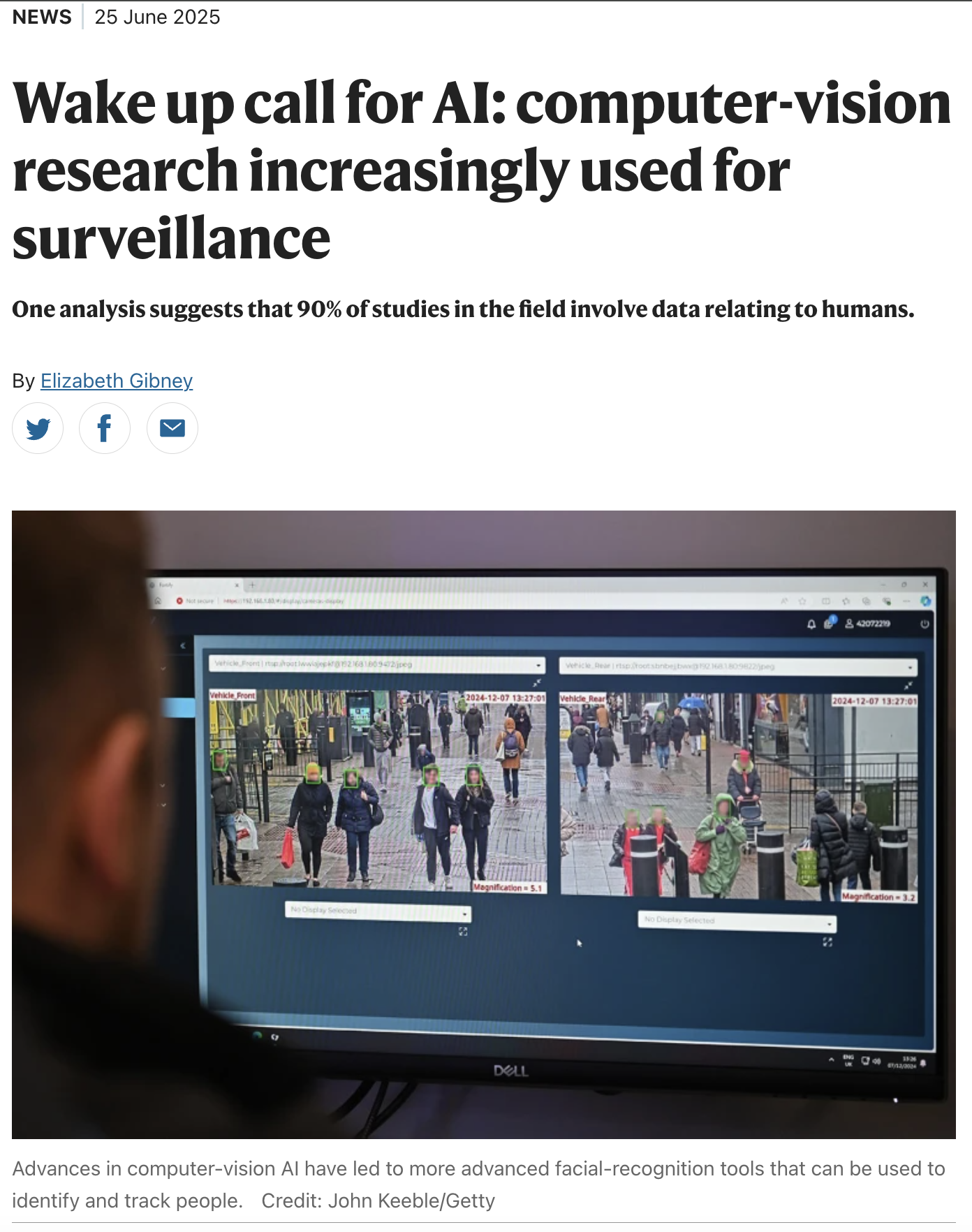 Gibney, Elizabeth. “Wake up Call for AI: Computer-Vision Research Increasingly Used for Surveillance.” Nature, June 25, 2025. https://doi.org/10.1038/d41586-025-01745-1. |